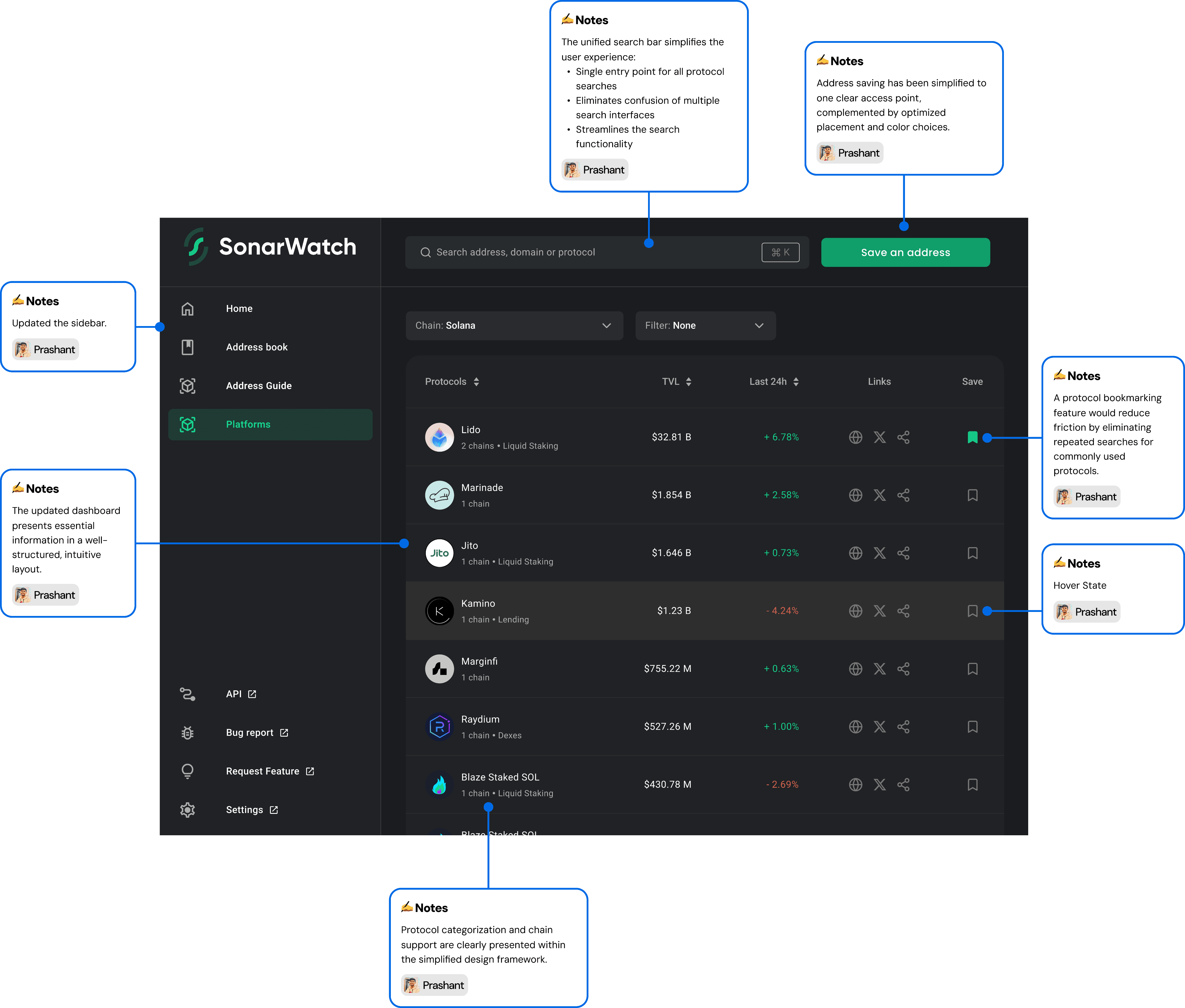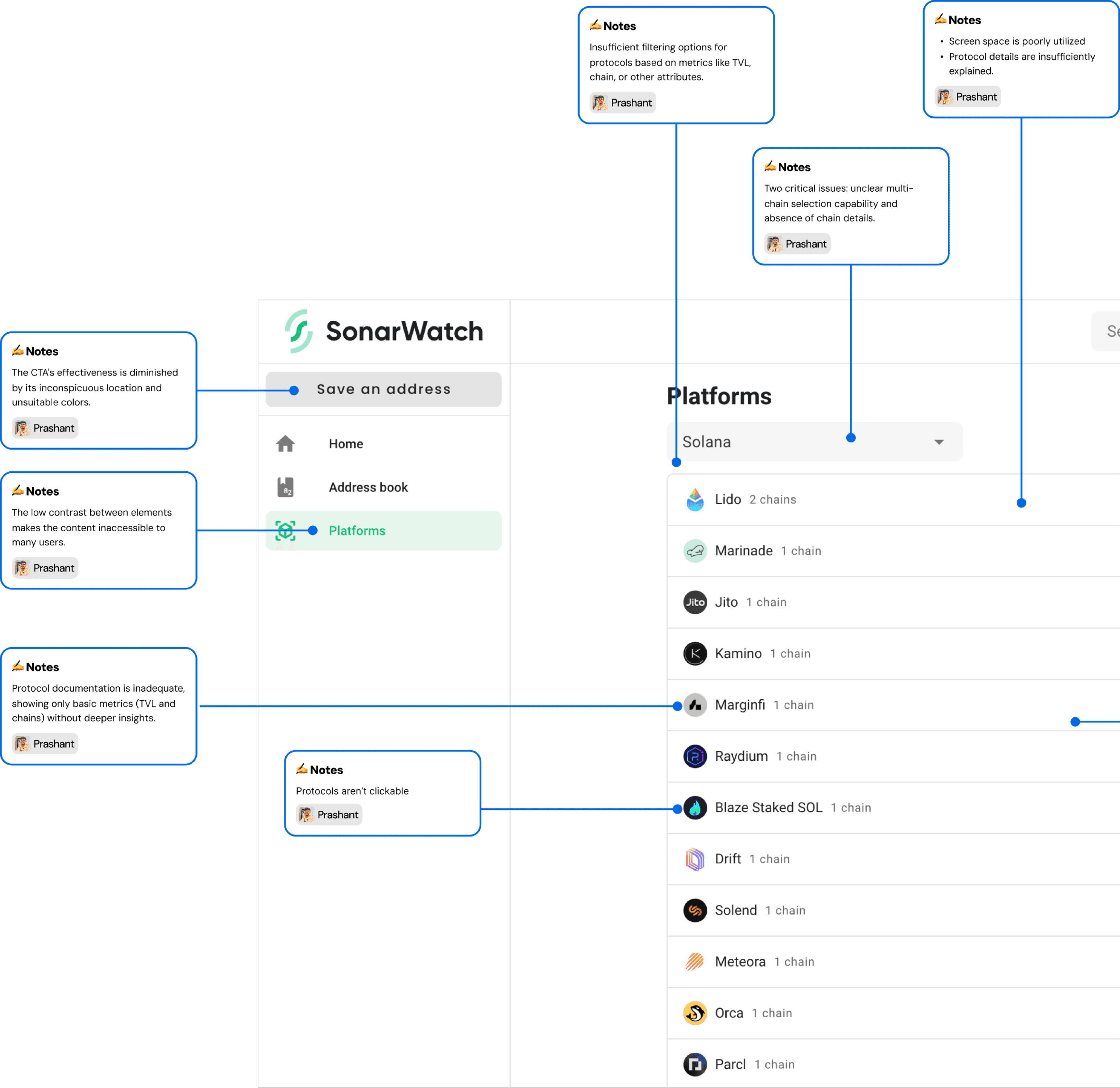 To design a more effective and accessible Platforms Page for SonarWatch, we conducted extensive user research and analyzed the current platform’s pain points. Our research focused on understanding the behaviors, expectations, and frustrations of different user groups, such as experienced DeFi participants, yield farmers, blockchain ecosystem enthusiasts, and casual investors.