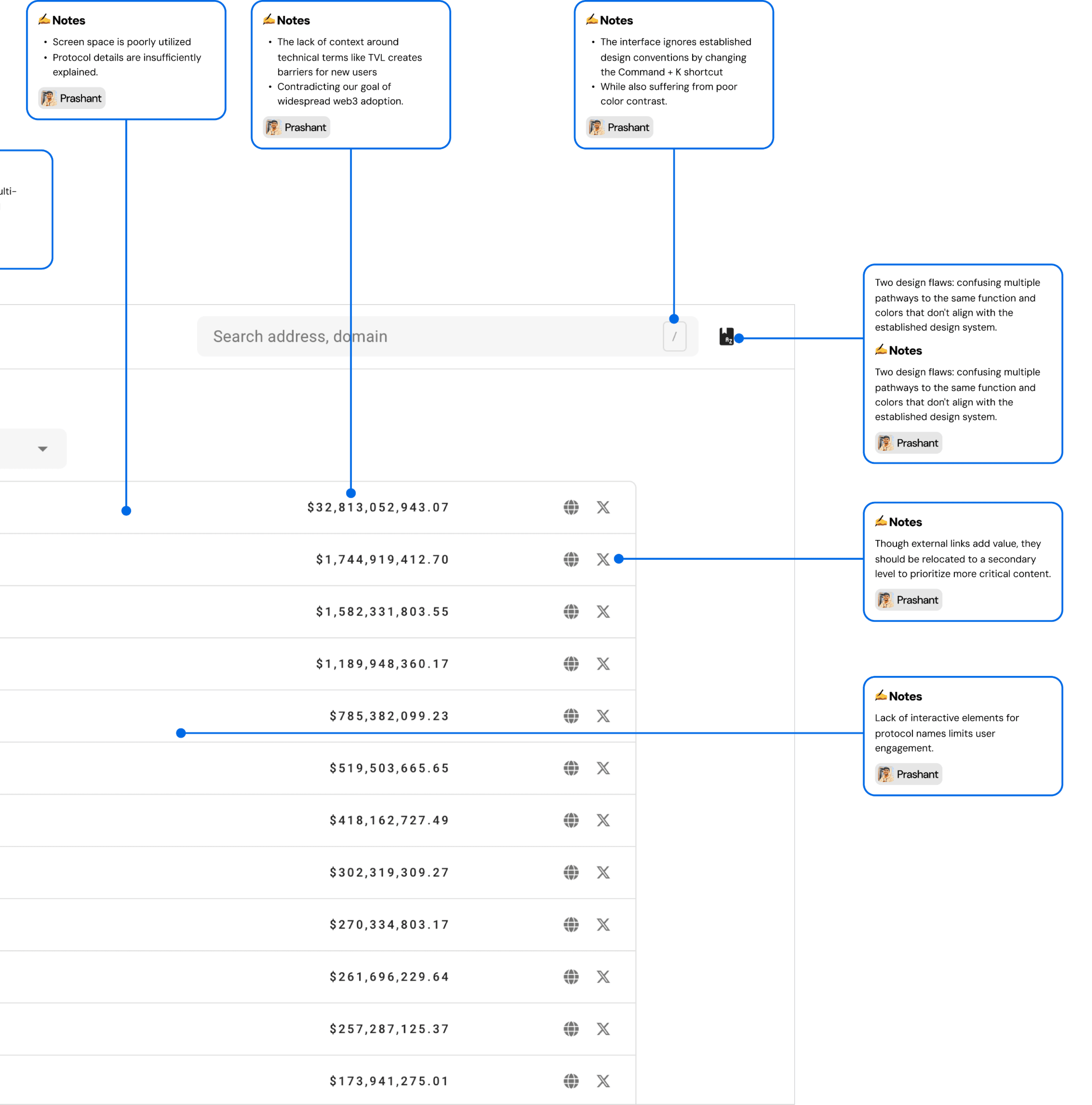 My goal was to enhance accessibility by introducing intuitive filters and a simplified layout. This allowed users to easily find platforms based on network or name and quickly view essential information like websites, social media links, and Total Value Locked (TVL).